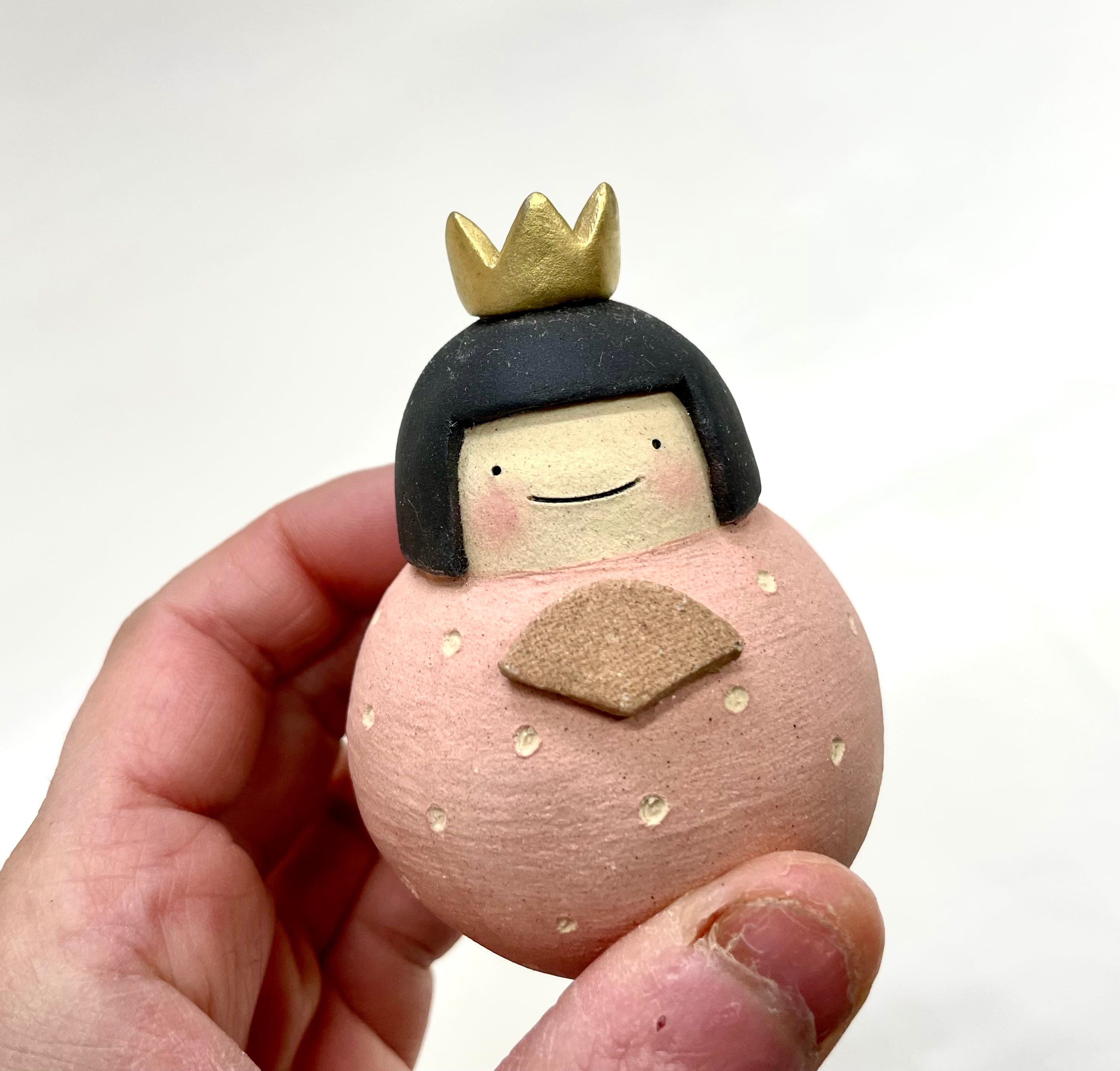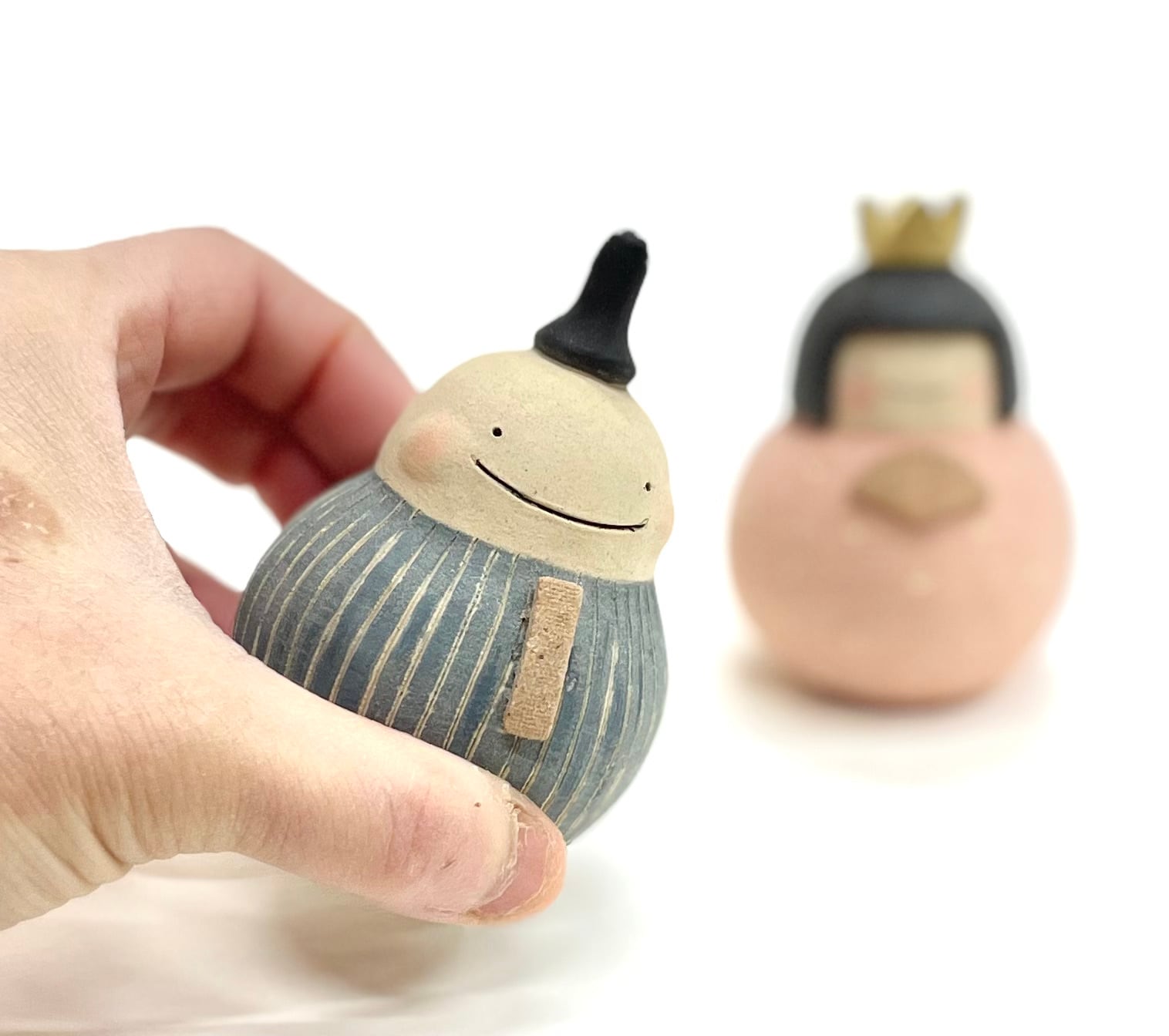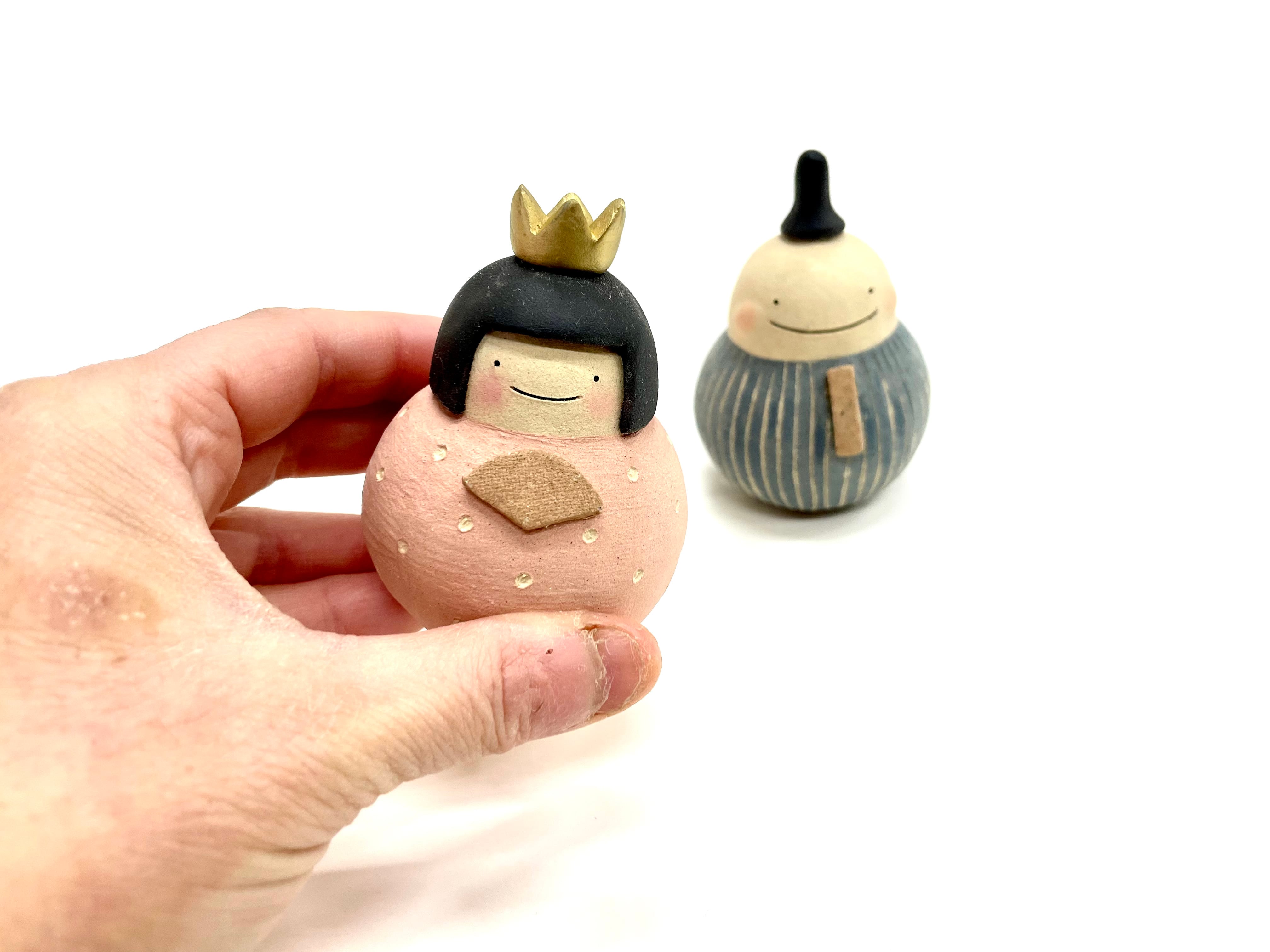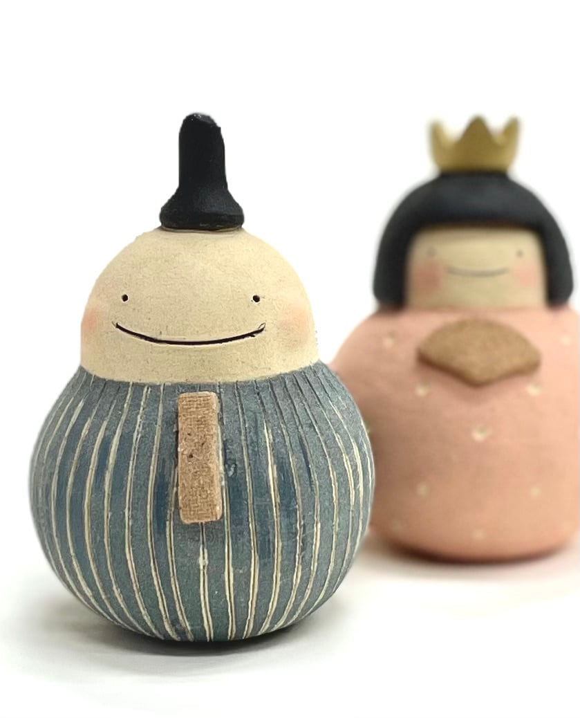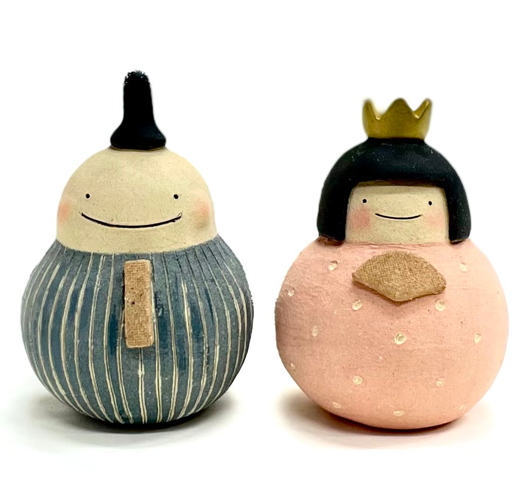 名前の通りだるまさん型のお雛様です。かわいらしい形とやさしい色合いのお雛様です。無釉薬で仕上げられた土の質感が魅力です。おかっぱ頭の可愛いいお雛様となんとも言えないユーモアな御代理様。二人の慢心の笑顔。見ているこちらもつい笑顔になってしまいます。
